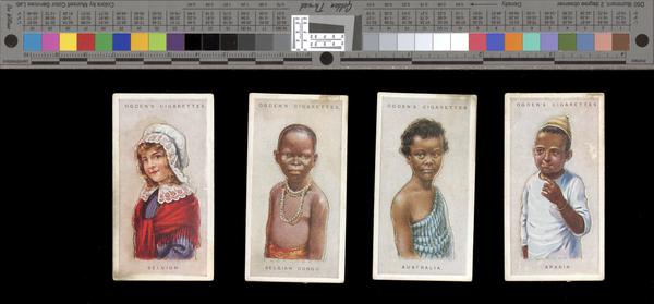 Series of pop out cigarette cards depicting waist-length portraits of children (boys and girls) of different nationalities attired in their "native" costume. Includes Arabia (boy); Australia (boy); Belgian Congo (boy); Belgium (girl); Bulgaria (boy); Burma (girl); Denmark (girl); Egypt (girl); England (boy); Greece (girl); Holland (girl); Hungary (boy); Italy (girl); Ireland (girl); Mexico (boy); Natal (girl); New Zealand (girl); Norway (girl); Palestine (girl); Patagonia (girl); Poland (girl); Portugal (boy); Rumania (girl); Russia (girl); Scotland (boy); Siam (boy); Spain (girl); Sweden (girl); Tahiti (girl); Tibet (girl); Tunis (girl); Turkey (girl); United States (girl); and Wales (girl). The Ogden Branch was originally founded by Thomas Ogden as the Ogdens Tobacco Company in 1860. In 1901, American Tobacco Company bought Ogden's Tobacco Company and it in turn was bought by Imperial Tobacco Co. in 1902. Ogden started to include cigarette cards in its packaging in 1894.