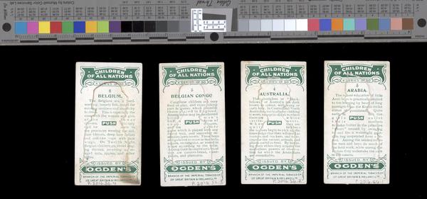 Series of pop out cigarette cards depicting waist-length portraits of children (boys and girls) of different nationalities attired in their "native" costume. Includes Arabia (boy); Australia (boy); Belgian Congo (boy); Belgium (girl); Bulgaria (boy); Burma (girl); Denmark (girl); Egypt (girl); England (boy); Greece (girl); Holland (girl); Hungary (boy); Italy (girl); Ireland (girl); Mexico (boy); Natal (girl); New Zealand (girl); Norway (girl); Palestine (girl); Patagonia (girl); Poland (girl); Portugal (boy); Rumania (girl); Russia (girl); Scotland (boy); Siam (boy); Spain (girl); Sweden (girl); Tahiti (girl); Tibet (girl); Tunis (girl); Turkey (girl); United States (girl); and Wales (girl). The Ogden Branch was originally founded by Thomas Ogden as the Ogdens Tobacco Company in 1860. In 1901, American Tobacco Company bought Ogden's Tobacco Company and it in turn was bought by Imperial Tobacco Co. in 1902. Ogden started to include cigarette cards in its packaging in 1894.