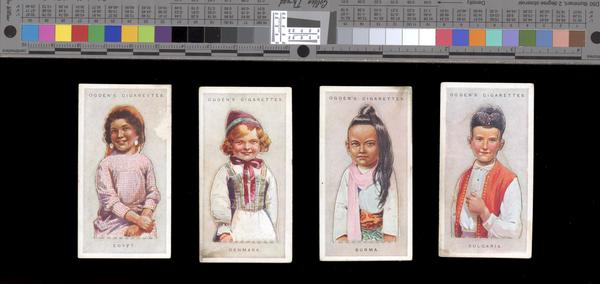 Series of pop out cigarette cards depicting waist-length portraits of children (boys and girls) of different nationalities attired in their "native" costume. Includes Arabia (boy); Australia (boy); Belgian Congo (boy); Belgium (girl); Bulgaria (boy); Burma (girl); Denmark (girl); Egypt (girl); England (boy); Greece (girl); Holland (girl); Hungary (boy); Italy (girl); Ireland (girl); Mexico (boy); Natal (girl); New Zealand (girl); Norway (girl); Palestine (girl); Patagonia (girl); Poland (girl); Portugal (boy); Rumania (girl); Russia (girl); Scotland (boy); Siam (boy); Spain (girl); Sweden (girl); Tahiti (girl); Tibet (girl); Tunis (girl); Turkey (girl); United States (girl); and Wales (girl). The Ogden Branch was originally founded by Thomas Ogden as the Ogdens Tobacco Company in 1860. In 1901, American Tobacco Company bought Ogden's Tobacco Company and it in turn was bought by Imperial Tobacco Co. in 1902. Ogden started to include cigarette cards in its packaging in 1894.