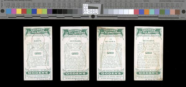 Series of pop out cigarette cards depicting waist-length portraits of children (boys and girls) of different nationalities attired in their "native" costume. Includes Arabia (boy); Australia (boy); Belgian Congo (boy); Belgium (girl); Bulgaria (boy); Burma (girl); Denmark (girl); Egypt (girl); England (boy); Greece (girl); Holland (girl); Hungary (boy); Italy (girl); Ireland (girl); Mexico (boy); Natal (girl); New Zealand (girl); Norway (girl); Palestine (girl); Patagonia (girl); Poland (girl); Portugal (boy); Rumania (girl); Russia (girl); Scotland (boy); Siam (boy); Spain (girl); Sweden (girl); Tahiti (girl); Tibet (girl); Tunis (girl); Turkey (girl); United States (girl); and Wales (girl). The Ogden Branch was originally founded by Thomas Ogden as the Ogdens Tobacco Company in 1860. In 1901, American Tobacco Company bought Ogden's Tobacco Company and it in turn was bought by Imperial Tobacco Co. in 1902. Ogden started to include cigarette cards in its packaging in 1894.
