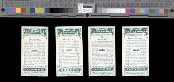 Series of pop out cigarette cards depicting waist-length portraits of children (boys and girls) of different nationalities attired in their "native" costume. Includes Arabia (boy); Australia (boy); Belgian Congo (boy); Belgium (girl); Bulgaria (boy); Burma (girl); Denmark (girl); Egypt (girl); England (boy); Greece (girl); Holland (girl); Hungary (boy); Italy (girl); Ireland (girl); Mexico (boy); Natal (girl); New Zealand (girl); Norway (girl); Palestine (girl); Patagonia (girl); Poland (girl); Portugal (boy); Rumania (girl); Russia (girl); Scotland (boy); Siam (boy); Spain (girl); Sweden (girl); Tahiti (girl); Tibet (girl); Tunis (girl); Turkey (girl); United States (girl); and Wales (girl). The Ogden Branch was originally founded by Thomas Ogden as the Ogdens Tobacco Company in 1860. In 1901, American Tobacco Company bought Ogden's Tobacco Company and it in turn was bought by Imperial Tobacco Co. in 1902. Ogden started to include cigarette cards in its packaging in 1894.
