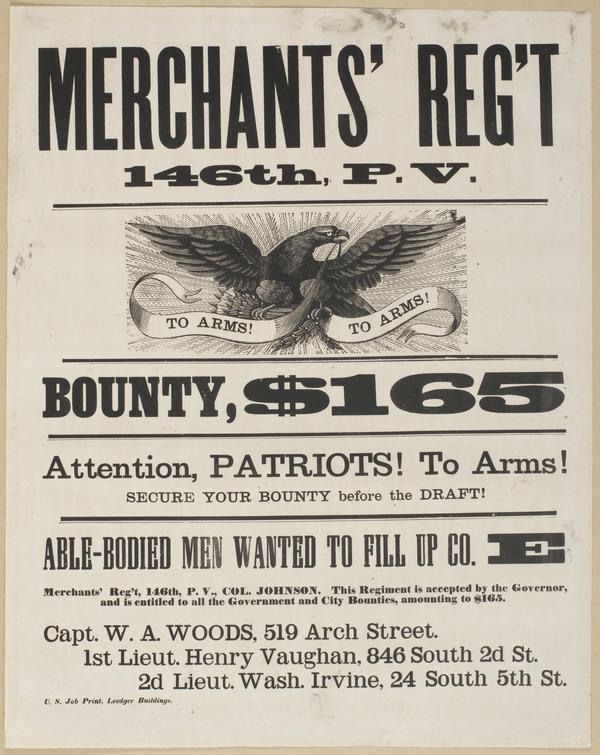 Merchants' Reg't 146th, P.V. : Bounty $165 Attention, patriots! To arms! Secure your bounty before the draft! Able-bodied men wanted to fill up Co. E Marchants' Reg't, 146th, P.V., Col. Johnson. This regiment is accepted by the governor, and is entitled to all the government and city bounties, amounting to $165. / Capt. W.A. Woods, 519 Arch Street. 1st Lieut. Henry Vaughan, 846 South 2d St. 2d Lieut. Wash. Irvine, 24 South 5th St.
