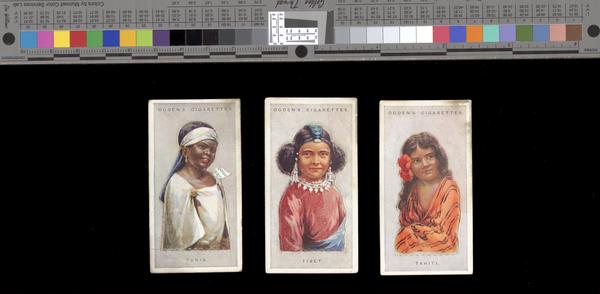 Series of pop out cigarette cards depicting waist-length portraits of children (boys and girls) of different nationalities attired in their "native" costume. Includes Arabia (boy); Australia (boy); Belgian Congo (boy); Belgium (girl); Bulgaria (boy); Burma (girl); Denmark (girl); Egypt (girl); England (boy); Greece (girl); Holland (girl); Hungary (boy); Italy (girl); Ireland (girl); Mexico (boy); Natal (girl); New Zealand (girl); Norway (girl); Palestine (girl); Patagonia (girl); Poland (girl); Portugal (boy); Rumania (girl); Russia (girl); Scotland (boy); Siam (boy); Spain (girl); Sweden (girl); Tahiti (girl); Tibet (girl); Tunis (girl); Turkey (girl); United States (girl); and Wales (girl). The Ogden Branch was originally founded by Thomas Ogden as the Ogdens Tobacco Company in 1860. In 1901, American Tobacco Company bought Ogden's Tobacco Company and it in turn was bought by Imperial Tobacco Co. in 1902. Ogden started to include cigarette cards in its packaging in 1894.