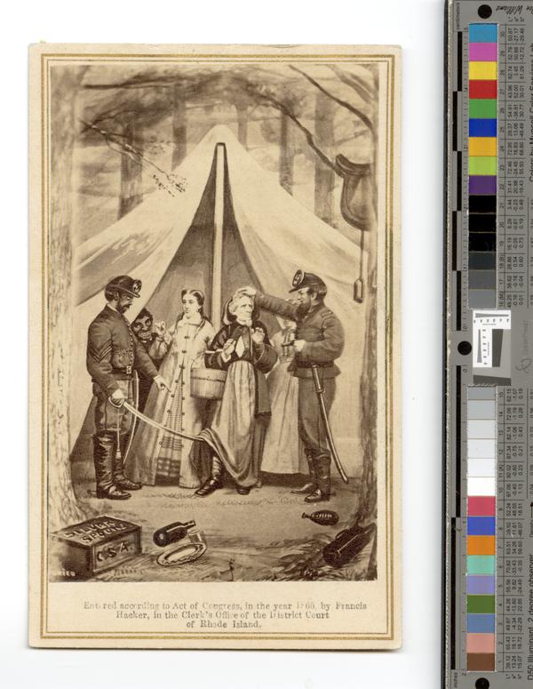 Carte-de-visite caricature satirizing the unusual circumstances of the capture of the Confederate president, detained by Union cavalry troops on May 10, 1865, while wearing his wife's overcoat and shawl as a disguise. Depicts Davis being inspected by Union soldiers as he emerges from a tent, holding a basket, while attired in a hood and skirt. His wife, Varina Davis, stands next to him. An African American enslaved servant depicted with oversize and exagerrated features peers from behind the tent flap. Bottles and a case marked "Silver Spoons, C.S.A." (an allusion to Jefferson's safeguarding of the remaining Confederate treasury) lay on the ground in front of the tent. Also shows a saddle hanging in a tree to the right of the tent.