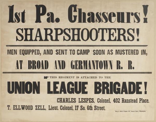 1st Pa. Chasseurs! Sharpshooters! : Men equipped, and sent to camp soon as mustered in, at Broad and Germantown R.R. This regiment is attached to the Union League Brigade! / Charles Lespes, Colonel, 402 Ranstead Place. T. Ellwood Zell, Lieut. Colonel, 17 So. 6th Street.