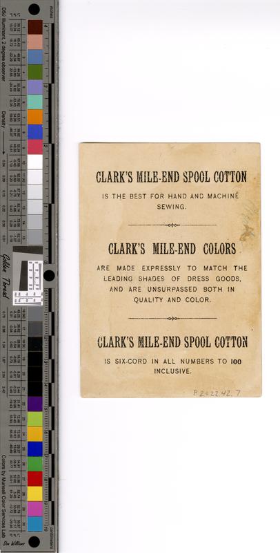 Advertising text printed on verso: Clark's Mile-End Spool Cotton is the best for hand and machine sewing. Clark's Mile-End