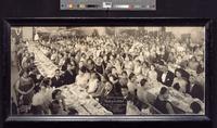 Panoramic group portrait photograph depicting over one hundred African American men and women, of all ages, at a testimonial banquet of the Improved Benevolent Protective Order of Elks of the World for Eugenia Neal (1873-1949). The attendees, attired in evening wear, sit at rows of tables and a few booths in the right of the room. Attendees wear suits, tuxedos, and evening and cocktail dresses. Most of the sitters do not smile and face the camera. Some are turned away or eating. Some of the men wear their I.B.P.O.E.W. fezzes. In the right background, one woman has an arch of flowers over her. The tables are covered in white tablecloths and lined with plates of food, serving platters, and silver pitchers. In the background, at the back of the room, a small band of men musicians is seated next to a woman at a piano. Streamers and a paper bell adorn the ceiling. The O.V. Catto Elks Lodge began in 1903 as a chapter of the Improved Benevolent Protective Order of Elks of the World established in 1897 with a mission to "practice charity by providing and performing charitable services in our communities throughout the world and by promoting harmony, friendship, and unity among our esteemed members." By 1926, the Lodge had over 3000 members, and in 1929, it relocated to a new building that included a boxing ring, basketball court, and rooftop garden, at 16th and Fitzwater. Eugenia Neal, born Eugenia Brisby in Virginia, worked as a typesetter in Philadelphia by 1920. Married to Moses Neal in 1896, the couple resided in Atlantic City before relocating to Philadelphia by 1910. As a Daughter Ruler, Neal lead the Keystone Temple with her male counterpart, Exalted Ruler, and "under their leadership, all Elks shall show[ed] truth in activities and live[d] to help others, while promoting Brotherly and Sisterly Love to all."