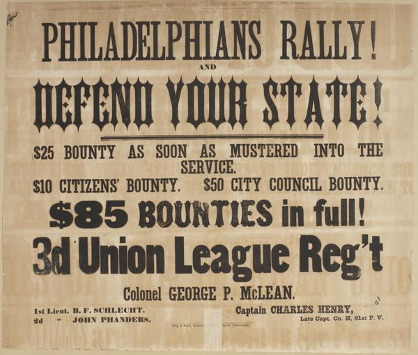 Philadelphians rally! and defend your state! : $25 bounty as soon as mustered into the service. $10 Citizens' bounty. $50 City Council bounty. $85 bounties in full! 3d Union League Reg't Colonel George P. McLean. / Captain Charles Henry, late Capt. Co. H, 91st P.V. 1st Lieut. B.F. Schlecht. 2d " John Phanders.