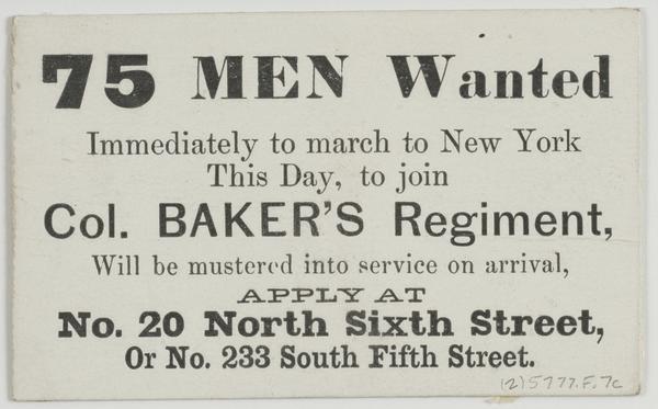 75 men wanted immediately to march to New York this day, to join Col. Baker's Regiment, : will be mustered into service on arrival, apply at No. 20 North Sixth Street, or No. 233 South Fifth Street.