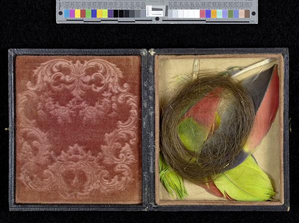 Cased image accompanied by a lock of hair and four feathers from an Amazon parrot. |