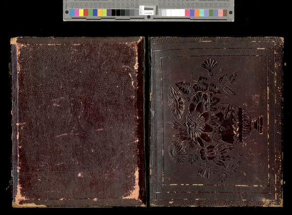 Case: Leather. Bouquet of mixed flowers in a vase. No design on verso. |