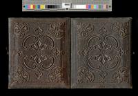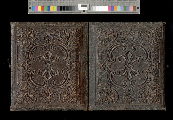 Case: Leather. Decorative geometric and leaf pattern in the center with leaves in the corners. Same design on verso. |