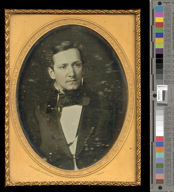 Half-length portrait of an unidentified white man, slightly facing right. Sitter has dark-colored hair, combed and parted to the left, and is attired in a white shirt with a turned-up collar, a broad, black bowtie, and a black jacket. His cheeks are tinted pink.