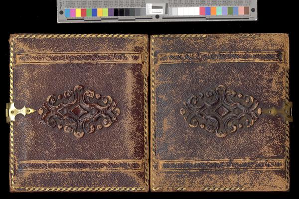 Case: Leather. Scroll pattern in center. Framed above and below by a border pattern with a scroll design. Same design on verso.