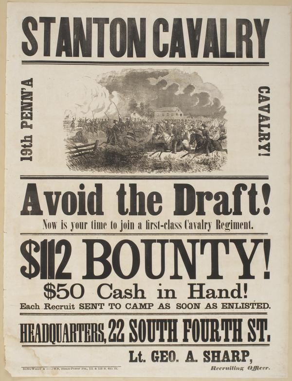 Stanton Cavalry 19th Penn'a Cavalry! : Avoid the draft! Now is your time to join a first-class cavalry regiment. $112 bounty! $50 cash in hand! Each recruit sent to camp as soon as enlisted. Headquarters, 22 South Fourth St. / Lt. Geo. A. Sharp, recruiting officer.