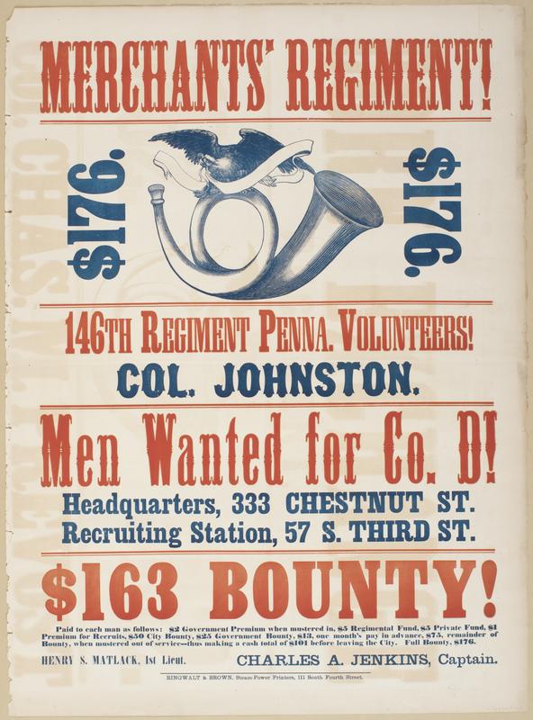Merchants' Regiment! $176. $176. 146th Regiment Penna. Volunteers! Col. Johnston. : Men wanted for Co. D! Headquarters, 333 Chestnut St. Recruiting station, 57 S. Third St. $163 bounty! Paid to each man as follows: $2 government premium when mustered in, $5 regimental fund, $5 private fund, $1 premium for recruits, $50 city bounty, $25 government bounty, $13, one month's pay in advance, $75, remainder of bounty, when mustered out of service--thus making a cash total of $101 before leaving the city. Full bounty, $176. / Henry S. Matlack, 1st Lieut. Charles A. Jenkins, Captain.