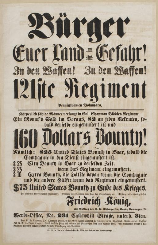 Bürger Euer Land ist in Gefahr! : Zu den Waffen! Zu den Waffen! 121ste Regiment Pennsylvanien Voluntärs. Körperlich fähige Männer verlangt in Col. Chapman Biddles Regiment. ... 160 dollars bounty! ... / Friedrich König, im Auftrag von J.G. Rosengarten, Capt., Compagnie D. Werbe-Office, No. 231 Callowhill Strasse, unterh. 3ten. .... ...