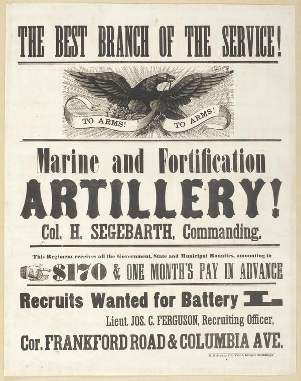 The best branch of the service! : Marine and fortification artillery! Col. H. Segebarth, commanding. This regiment receives all the government, state and municipal bounties, amounting to $170 & one month's pay in advance Recruits wanted for Battery L / Lieut. Jos. C. Ferguson, recruiting officer, cor. Frankford Road & Columbia Ave.