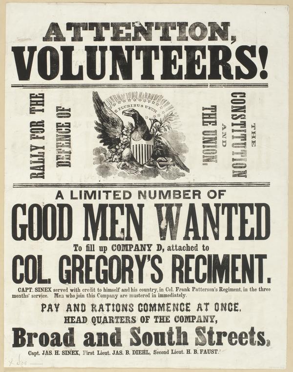 Attention, volunteers! : Rally for the defence of the Constitution and the Union. A limited number of good men wanted to fill up Company D, attached to Col. Gregory's regiment. Capt. Sinex served with credit to himself and his country, in Col. Frank Patterson's regiment, in the three months' service. Men who join this company are mustered in immediately. Pay and rations to commence at once. Head quarters of the company, Broad and South Streets. / Capt. Jas. [sic] H. Sinex, First Lieut. Jas. B. Diehl, Second Lieut. H.B. Faust.