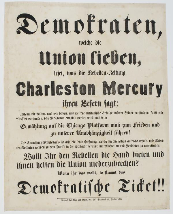 Demokraten, welche die Union lieben,: leset, was die Rebellen-Zeitung Charleston mercury ihren Lesern sagt: "Wenn wir halten, was wir haben, und weitere militärische Erfolge underer Feinde verhindern, so ist jede Aussicht vorhanden, dass McClellan erwä hlt werden wird, und seine Erwählung auf die Chicago Platform muss zum Frieden und zu underer Unabhängigkeit führen! Die Erwählung McClellan's ist also die letzte Hoffnung, welche die Rebellion aufrecht erhält, un Rebellen-Soldaten werden zu dem Zwecke in die Schlacht geführt, um McClellan und Pendleton zu unterstützen. Wollt Ihr den Rebellen die Hand bieten und ihnen helfen die Union niederzubrechen? Wenn ihr das wollt, so stimmt dat Demokratische Ticket!!