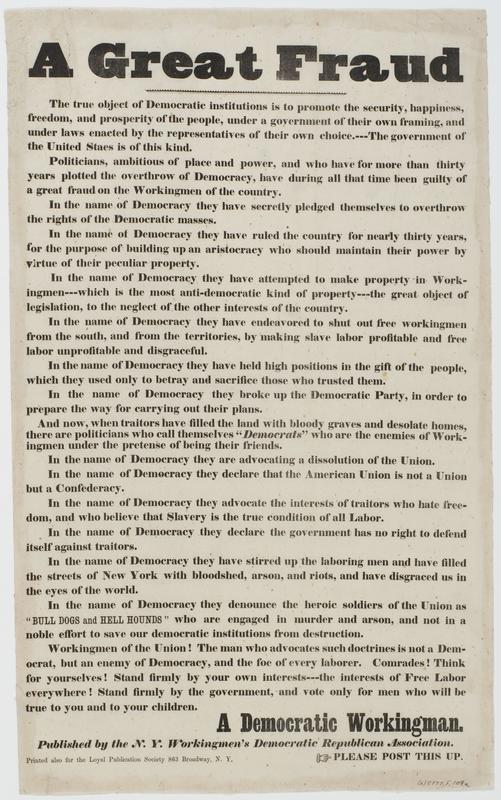 A great fraud. : The true object of democratic institutions is to promote the security, happiness, freedom, and prosperity of the people, under a government of their own framing, and under laws enacted by the representatives of their own choice.---The government of the Unites Staes [sic] is of this kind. Politicians, ambitious of place and power, and who have for more than thirty years plotted the overthrow of democracy, have during all that time been guilty of a great fraud on the workingmen of the country. ... In the name of democracy they have stirred up the laboring men and have filled the streets of New York with bloodshed, arson, and riots, and have disgraced us in the eyes of the world. ... Workingmen of the Union! The man who advocates such doctrines is not a democrat, but an enemy of democracy, and the foe of every laborer. ... / A democratic workingman.