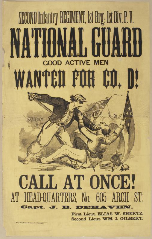 Second Infantry Regiment, 1st Brg: 1st Div. P.V. National Guard Good active men wanted for Co. D! : Call at once! At head-quarters, No. 605 Arch St. / Capt. J.B. Dehaven, First LIeut. Elias W. Shertz. Second Lieut. Wm. J. Gilbert.