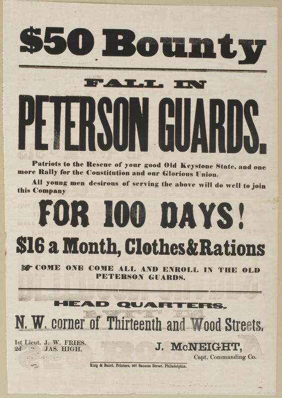 $50 bounty Fall in Peterson Guards. : Patriots to the rescue of your good old Keystone State, and one more rally for the Constitution and our glorious Union. All young men desirous of serving the above will do well to join this company for 100 days! $16 a month, clothes & rations Come one come all and enroll in the Old Peterson Guards. Head quarters, N.W. corner of Thirteenth and Wood Streets. / 1st Lieut. J.W. Fries. 2d " Jas. High. J. McNeight, Capt. commanding co.