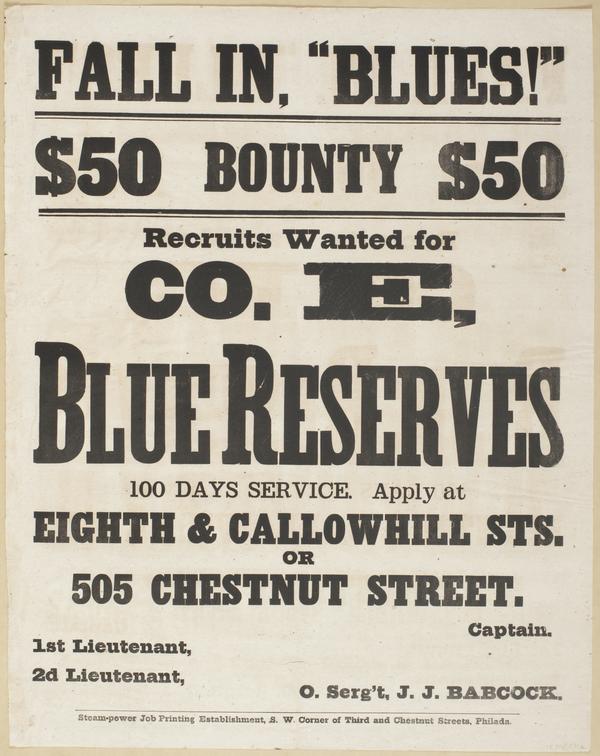 Fall in, "Blues!" : $50 bounty $50 Recruits wanted for Co. E, Blue Reserves 100 days service. Apply at Eighth & Callowhill Sts. or 505 Chestnut Street. / [blank] Captain. 1st Lieutenant, [blank] 2d Lieutenant, [blank] O. Serg't, J.J. Babcock.