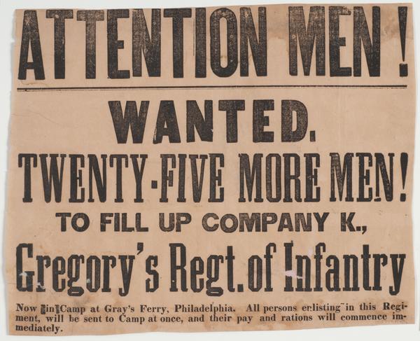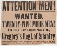 Attention men! : Wanted, twenty-five more men! To fill up Company K., Gregory's Regt. of Infantry now in camp at Gray's Ferry, Philadelphia. All persons enlisting in this regiment, will be sent to camp at once, and their pay and rations will commence immediately.