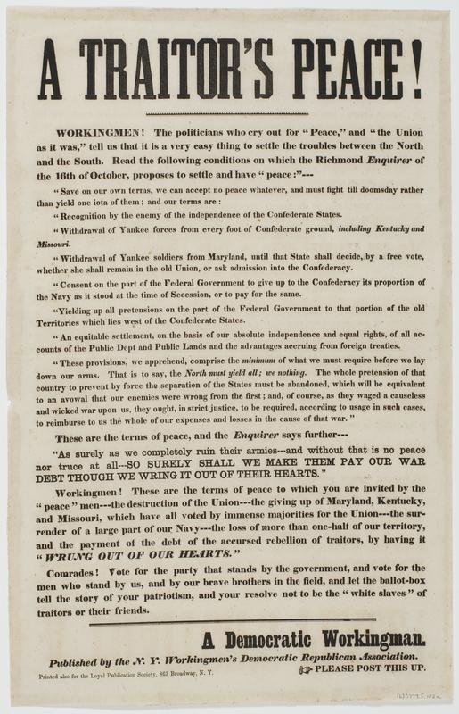 A traitor's peace! : Workingmen! The politicians who cry out for "peace," and "the Union as it was," tell us that it is a very easy thing to settle the troubles between the North and the South. Read the following conditions on which the Richmond Enquirer of the 16th of October, proposed to settle and have "peace:"--- ... Comrades! Vote for the party that stands by the government, and vote for the men who stand by us, and by our brave brothers in the field, and let the ballot-box tell the story of your patriotism, and your resolve not to be the "white slaves" of traitors or their friends. / A democratic workingman.