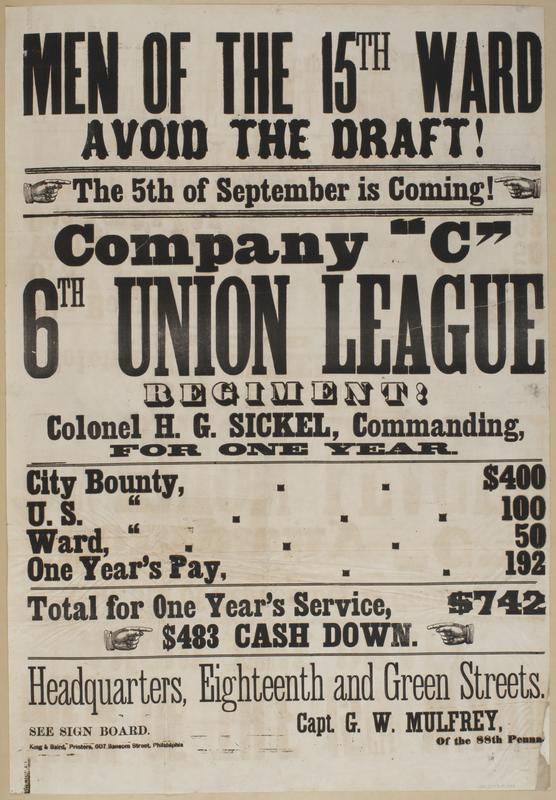 Men of the 15th Ward avoid the draft! : The 5th of September is coming! Company "C" 6th Union League Regiment! Colonel H.G. Sickel, commanding, for one year. ... Total for one year's service, $742 $483 cash down. Headquarters, Eighteenth and Green Streets. See sign board. / Capt. G.W. Mulfrey, of the 88th Penna.