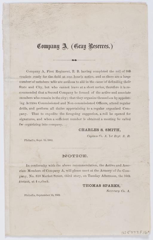 Company A, (Gray Reserves.) : Company, First Regiment, R.B. having completed the roll of 100 muskets ready for the field at one hour's notice, and as there are a large number of members who are anxious to aid in the cause of defending their state and city, but who cannot leave at a short notice, therefore it is recommended that a second company be formed of the active and associate members who remain in the city; ... / Charles S. Smith, Captain Co. A. 1st Regt. R.B. Philad'a, Sept. 13, 1862. Notice. In conformity with the above recommendation, the active and associate members of members of Company A, will please meet at the armory of the company, No. 810 Market Street, third story, on Tuesday afternoon, the 16th, at 4 o'clock. Thomas Sparks, secretary Co. A. Philad'a, September 15, 1862.
