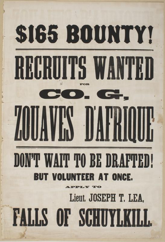 $165 bounty! Recruits wanted for Co. G, Zouaves d'Afrique : Don't wait to be drafted! But volunteer at once. / Apply to Lieut. Joseph T. Lea, Falls of Schuylkill.