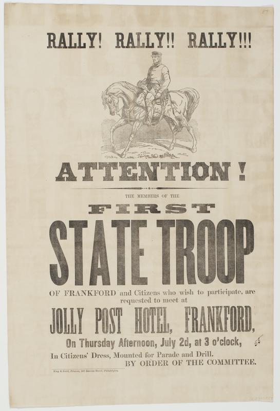 Rally! Rally!! Rally!!! Attention! : The members of the First State Troop of Frankford and citizens who wish to participate, are requested to meet at Jolly Post Hotel, Frankford, on Thursday afternoon, July 2d, at 3 o'clock, in citizens' dress, mounted for parade and drill. / By order of the committee.