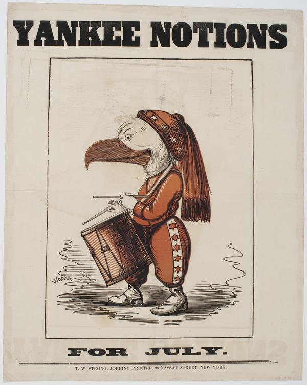 The illustration, signed Woolf, shows an eagle dressed as a drummer boy. |