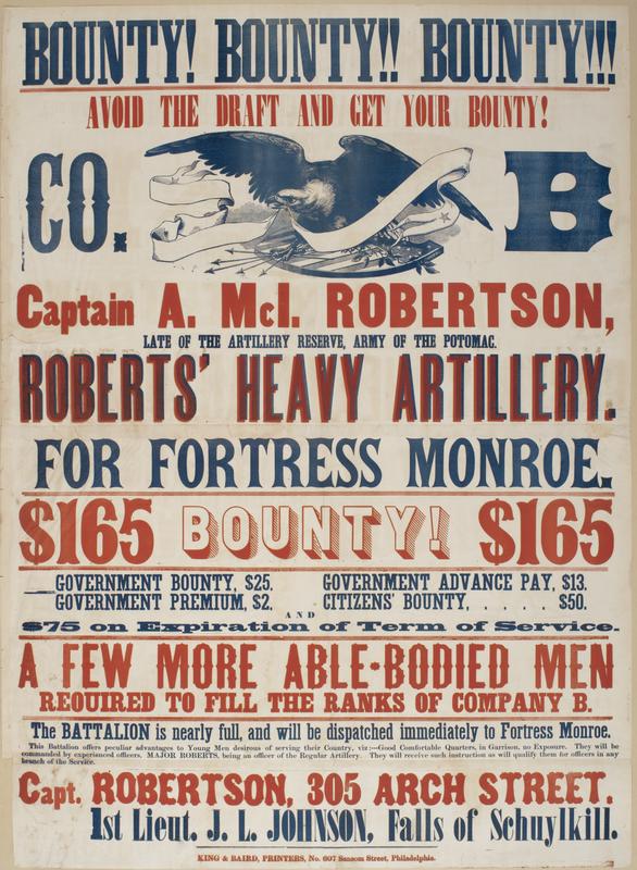 Bounty! Bounty!! Bounty!!! : Avoid the draft and get your bounty! Co. B Capt. A. McI. Robertson, late of the artillery reserve, Army of the Potomac. Roberts' Heavy Artillery. For Fortress Monroe. $165 bounty! $165 Government bounty, $25. Government premium, $2. Government advance pay, $13. Citizens' Bounty, $50. And $75 on expiration of term of service. A few more able-bodied men reouired [sic] to fill the ranks of Company B. The battalion is nearly full, and will be dispatched immediately to Fortress Monroe. This battalion offers peculiar advantages to young men desirous of serving their country, viz:---good comfortable quarters, in garrison, no exposure. They will be commanded by experienced officers, Major Roberts, being an officer of the regular artillery. They will receive such instruction as will qualify them for officers in any branch of the service. / Capt. Robertson, 305 Arch Street. 1st. Lieut. J.L. Johnson, Falls of Schuylkill.