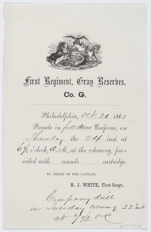First Regiment, Gray Reserves. Co. G. : Philadelphia, [blank] 186[blank] Parade in [blank] uniform, on [blank] the [blank] inst. at [blank] o'clock, [blank]m., at the armory, provided with [blank] rounds [blank] cartridge. / By order of the captain, H.J. White, First Sergt.
