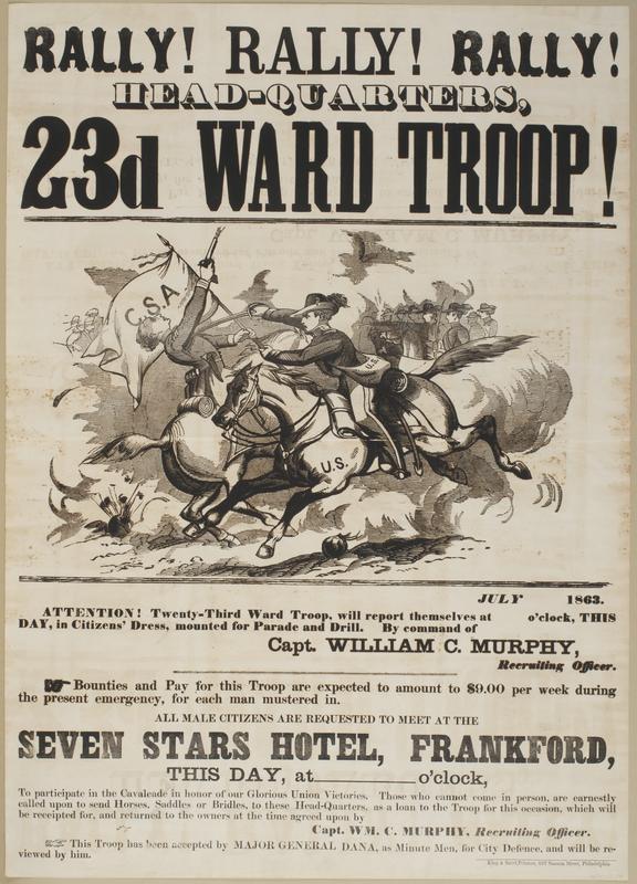 Rally! Rally! Rally! Head-quarters, 23d Ward Troop! : July [blank] 1863. Attention! Twenty-third Ward Troop, will report themselves at [blank] o'clock, this day, in citizens' dress, mounted for parade and drill. / By command of Capt. William C. Murphy, recruiting officer. Bounties and pay for this troop are expected to amount to $9.00 per week during the present emergency, for each man mustered in. All male citizens are requested to meet at the Seven Stars Hotel, Frankford, this day, at [blank] o'clock, to participate in the cavalcade in honor of our glorious Union victories. Those who cannot come in person, are earnestly called upon to send horses, saddles or bridles, to these head-quarters, as a loan to the troop for this occasion, which will be receipted for, and returned to the owners at the time agreed upon by Capt. Wm. C. Murphy, recruiting officer. This troop has been accepted by Major General Dana, as minute men, for city defence, and will be reviewed by him.