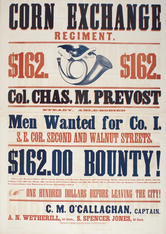 Corn Exchange Regiment. : $162. $162. Col. Chas. M. Prevost Steady, able-bodied men wanted for Co. I. S.E. cor. Second and Walnut Streets. $162.00 bounty! Paid to each recruit as follows: $2 government premium when recruit is mustered in; $10 Corn Exchange bounty, when sent to camp; $25 city bounty when the company is full; $25, city bounty, $25, one-fourth of government bounty, and $13, one month's pay in advance, when the regiment is formed; $75, remainder of government bounty when mustered out of service; thus making a total of one hundred dollars before leaving the city! / C.M. O'Callaghan, Captain. A.N. Wetherill, 1st Lieut., S. Spencer Jones, 2d Lieut.