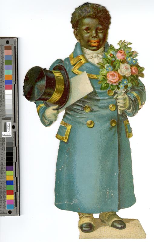 Scrap depicting a racist caricature of an African American boy doorman or butler. Shows the full-length portrait of the boy attired in a white shirt and bowtie; long, blue coat with gold buttons and trim; white gloves; and white and black boots. He looks at the viewer and smiles as he carries a bouquet of flowers in his left hand. He holds a black top hat with a gold band and a letter in his right hand.