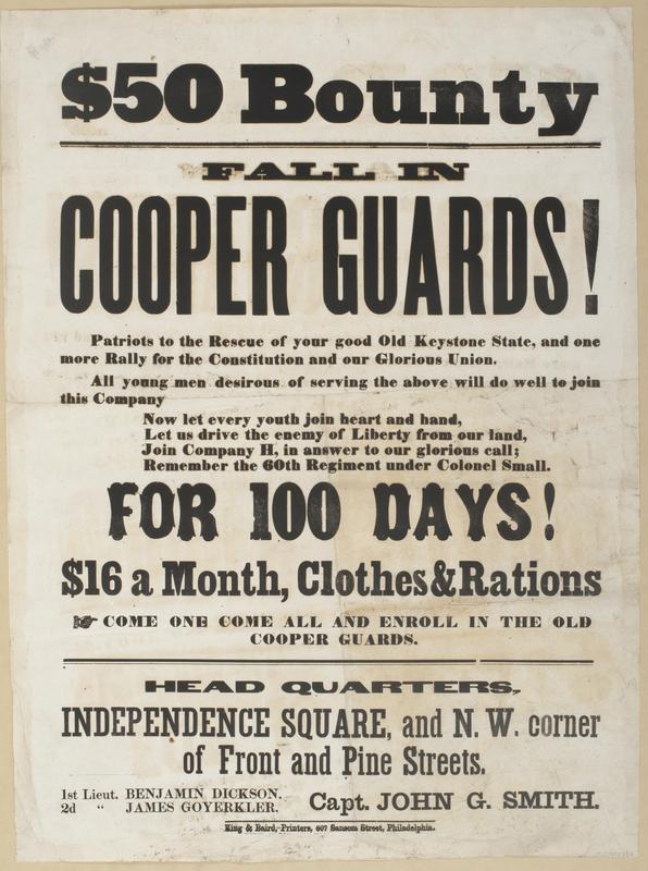 $50 bounty! Fall in Cooper Guards! : Patriots to the rescue of your good old Keystone State, and one more rally for the Constitution and our glorious Union. All young men desirous of serving the above will do well to join this company Now let every youth join heart and hand, Let us drive the enemy of liberty from our land, Join Company H, in answer to our glorious call; Remember the 60th Regiment under Colonel Small. For 100 days! $16 a month, clothes & rations Come one come all and enroll in the old Cooper Guards. Head quarters, Independence Square, and N.W. corner of Front and Pine Streets. / 1st Lieut. Benjamin Dickson. 2d " James Goyerkler. Capt. John G. Smith.