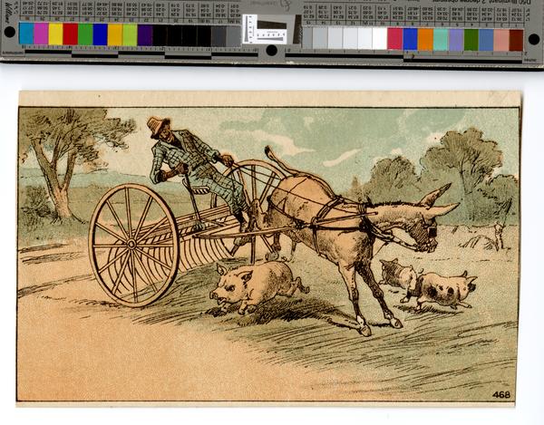 Racist, trade card specimen depicting a caricature of an African American man on mule-drawn plow. Shows the African American man, attired in a hat and a blue, plaid jacket and pants, sitting on top of a plow. He holds the lever to the plow in his right hand and the reins to the mule pulling the plow in his left hand. The mule is kicking its back legs into the air because three pigs are running around it. Trees are visible in the background.