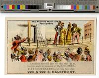 Racist trade card promoting the Working Shoe Makers Co-Operative Union and depicting a scene with African American caricatures