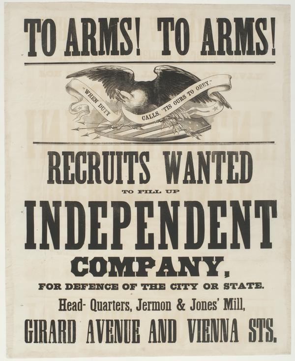 To arms! To arms! : Recruits wanted to fill up independent company, for defence of the city or state. Head-quarters, Jermon & Jones' Mill, Girard Avenue and Vienna Sts.