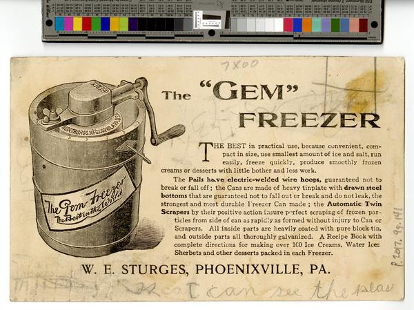 Advertising text printed on verso: The "Gem" freezer. The best in practical use, because convenient, compact in size, use