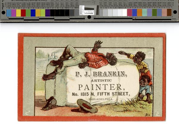 Trade card promoting painter P.J. Brankin and depicting a racist genre scene of an African American man being teasingly awoken by African American children. Figures are caricaturized and portrayed with exaggerated features. Shows a man, attired in a red, checkered shirt, blue pants, and one black boot, lying on his back, his right knee up, atop a large, white bundle. The boot on his left foot has fallen to the ground near his hat lying in front of the bundle. His left foot is bare. In the right, two mischievous boys peer around and over the bundle. The former, attired in a blue shirt, crouches to the ground from behind the bundle while the latter, attired in a yellow shirt with orange polka dots and orange pants, stretches out his right arm to poke the man's face with a piece of straw. In the background is a steamboat on a river. P.J. Brankin (1853-1928) was a house and sign painter who served as a president of the Master Painters' Association. By the 1920s, he was building and selling houses.