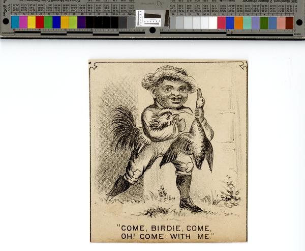 Racist trade card specimen depicting a caricature of an African American boy carrying a chicken and a duck. Shows the boy, attired in a straw hat, a long-sleeved shirt, pants with patches at the knees, and black shoes, smiling and looking at the viewer. He says, “come, birdie, come, oh! Come with me” as he carries a chicken under his right arm. In his left hand he holds a duck by the neck.