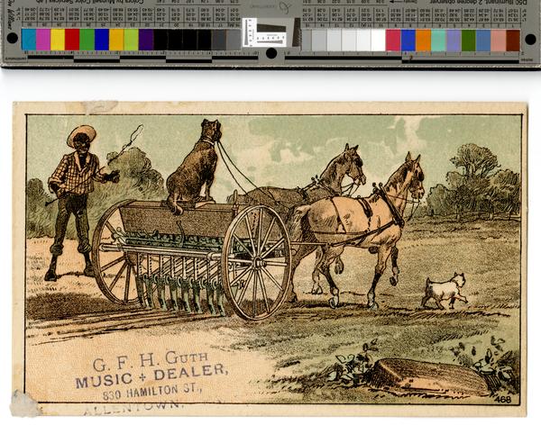 a collar guides the horses. Granville Francis Hiram Guth (1860-1939) owned a store in Allentown, Pa. selling pianos, organs,