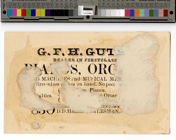 Guth's imprint is stamped on recto: G.F.H. Guth, Music dealer, 830 Hamilton St., Allentown. |