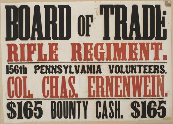 Board of Trade Rifle Regiment. : 156th Pennsylvania Volunteers. Col. Chas. Ernenwein. $165 bounty cash. $165